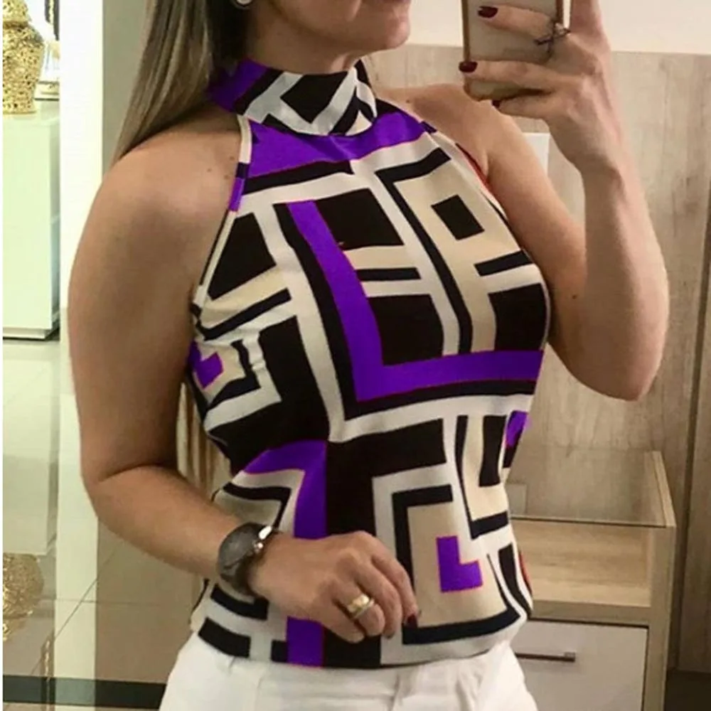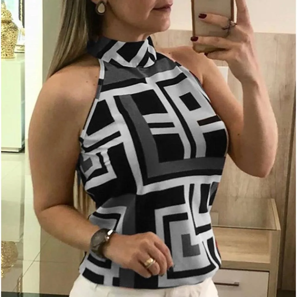2019 Plus Size Women's Geometric Halter Vest Summer Fashion Sleeveless Tank Tops Office Lady Tanks All-Matching Slim Vest M-3XL