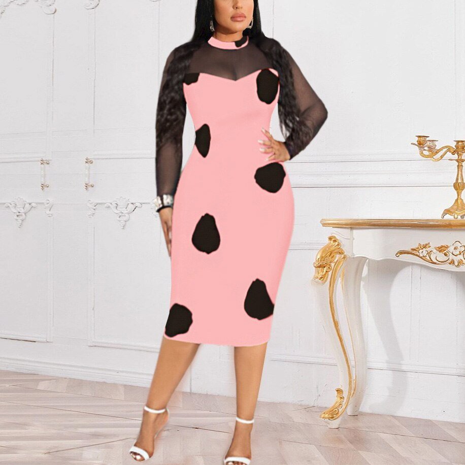 Bodycon Dresses for Women Round Neck Full Sleeve Polka Dot Printed Mid Calf Elegant Formal Business Office Ladies Vestidos Mujer