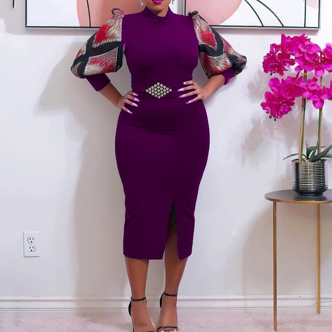 Office Dresses for Women Elegant Lantern Sleeve Sheath Round Neck High Waisted Split Mid Calf Fashion Formal Business Work Dress