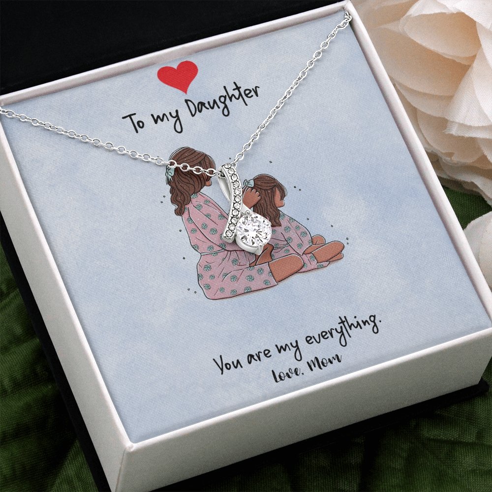 Melt her heart with this ALLURING BEAUTY necklace gift! The petite ribbon shaped pendant is finished with 14K white gold over stainless steel, and is embellished with dainty clear crystals surrounded by a sparkling 7mm round cut Cubic Zirconia.