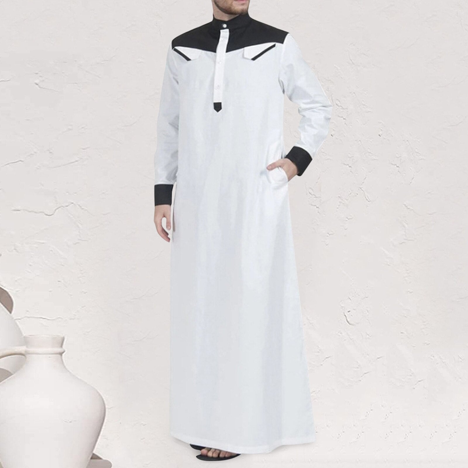 Traditional Muslim Clothing Contrast Color Muslim Dress Middle East Jubba Thobe Men Robe w/ Long Sleeves Mandarin Neck