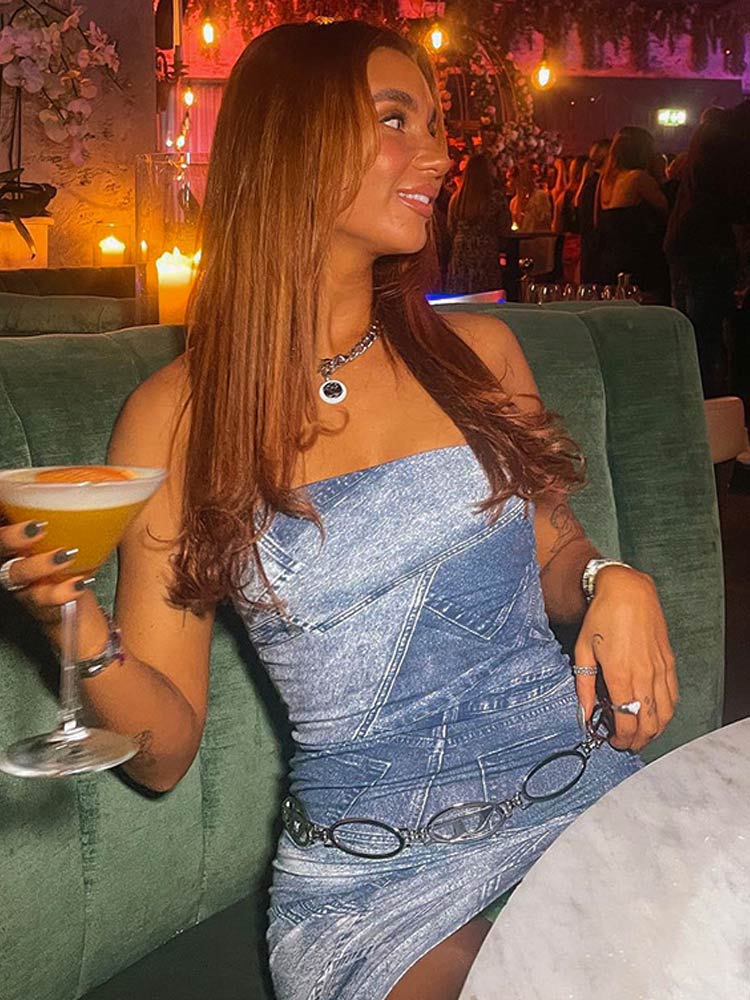 Women Denim Print Stitching Dress Sexy Strapless Sleeveless Short Female Dresses Elegant Party Evening Bodycon Vestidos