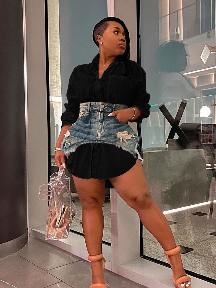 Women Denim Shirt Blouse Single Breasted Mini Dress Suit Long Sleeve Turn-down Collar Dress Fashion Irregular Two 2 Piece Set